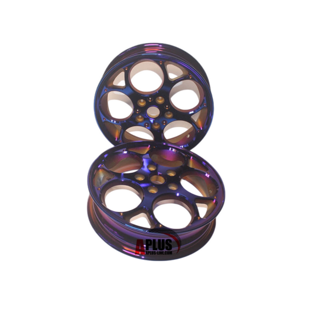 Dai alla tua Vespa Sprint o Vespa Primavera un look unico e sorprendente con lo stile Maru Cameon Edition Velgenset. Questi cerchi esclusivi hanno una finitura color camaleonte, che cambia a seconda della luce, combinata con dettagli macellati CNC per un aspetto di alta qualità e moderno. Lo strato di protezione extra fornisce una protezione a lungo termine contro l'usura e l'uso quotidiano.