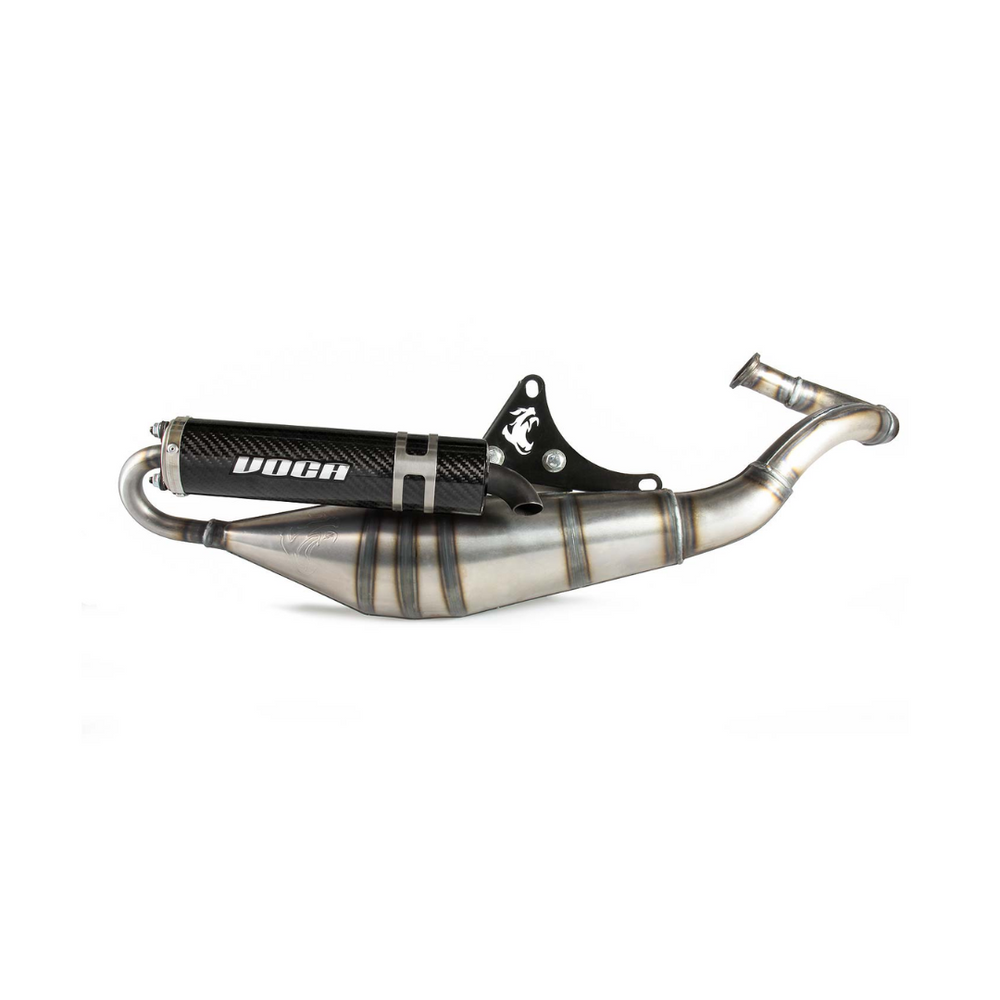 Exhaust voca 50/70cc carbon piaggio 2 stroke, the voca sabotage v2 exhaust system is an absolute all -rounder. With a 50cc standard cylinder, the voca sabotage V2 exhaust top performance reaches. With a 70cc sports cylinder, this voca exhaust system becomes a real powerhouse after removing the exhaust flange reduction (if the system is not used on public roads).